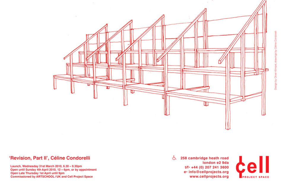 In November 2009 curator Milika Muritu invited Céline Condorelli to consider the framework of an art school in direct relation to Condorelli's ongoing work Support Structures to present Revision, Part II, which will function as the spatial setting for ARTSCHOOL/UK to take place in, as both an art project and a thinking site. The becoming of ARTSCHOOL/UK is an ongoing and dynamic process, which Revision, Part II within the context of Cell Project Space creates the physical framework for. Designed as a 7 unit modular based system, the work is intended to be used in a number of different ways. The mobility of the units will enable physical flexibility, creating opportunity for participants and contributors to invent scenarios and possibilities for how to speak and learn together. A revision of elevation furniture, originally made to be stepped on to reach elevated knowledge, i.e. books in libraries, Revision, Part II will transform the gallery into a learning space, hosting more collective forms of spectatorship, discussion and exchange, and allowing a range of encounters to take place. Each unit can be utilised as a communal desk and bench, or joined up to others to create an auditorium or performance space, with multiple transitional states between the formal and the ad-hoc, between set-ups reminiscent of Greek tragedies to just sitting on the library steps. Condorelli plays with historical contexts of learning but reverses established conventions by presenting an open-ended approach, and with it an invitation for reinvention in which the setting itself is part of a learning process. The work can be flat-packed for easy transportation to the future incarnations of ARTSCHOOL/UK.