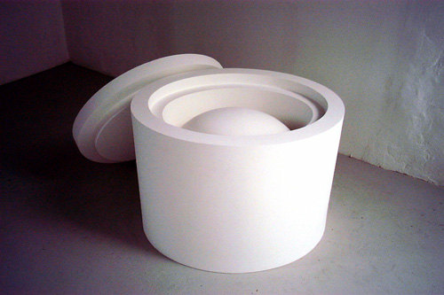 British artist Lolly Batty's contact with material is highly insular. The profound and contemplative attention of the maker is reflected in each piece. Purity of shape and metaphysical presence connects Batty's work to Lijn, both demonstrating a quasi-devotional relationship between artist and object. Trickery plays with the viewer as material heaviness is in reality lightweight; the painstaking process of laying a fine skin of plaster over a polystyrene base elevates the work to only just existing. Lolly Batty lives in works in London.