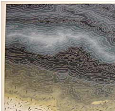 Painter Roger Kelly's subject matter includes destroyed buildings, natural disasters, landfill, toxic waste dumps, war torn landscapes, obscure N.A.S.A experiments and the debris of the collapsed, overgrown and ravaged. The images are either blended together seamlessly or left rough as brutal juxtapositions so that they slip in and out of contextual and material logic.These pictorial constructs are further distanced from their source and act as material for intricate linear drawings. This process condenses and empties out all of the tonal qualities and reduces the visual information to a plan or map from which the painting can be made.