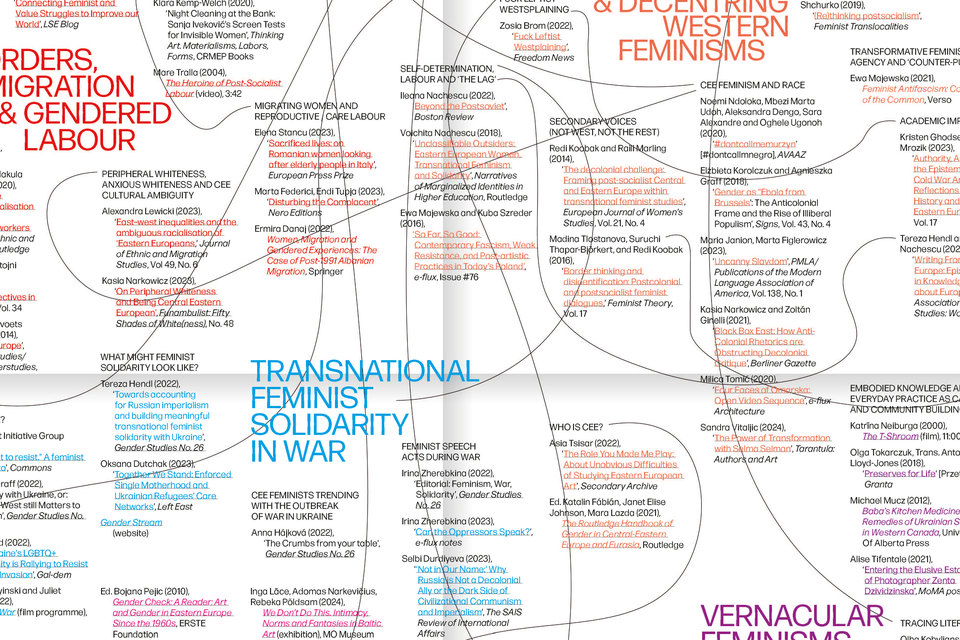 Embracing wom*n-led practices and organising before and under state socialisms, as well as academic and non-academic feminisms from the 'region' emerging after independence, the bibliography sketches a constellation of urgent and ongoing feminist and decolonial conversations that decentre Western feminism. Its sprawling form and content questions the scope of 'CEED Feminisms', problematising 'Central Eastern Europe' as a container for enormous cultural diversity and contextualising feminist discourses bound to post/state socialism, anti/imperialism and de/colonialism.