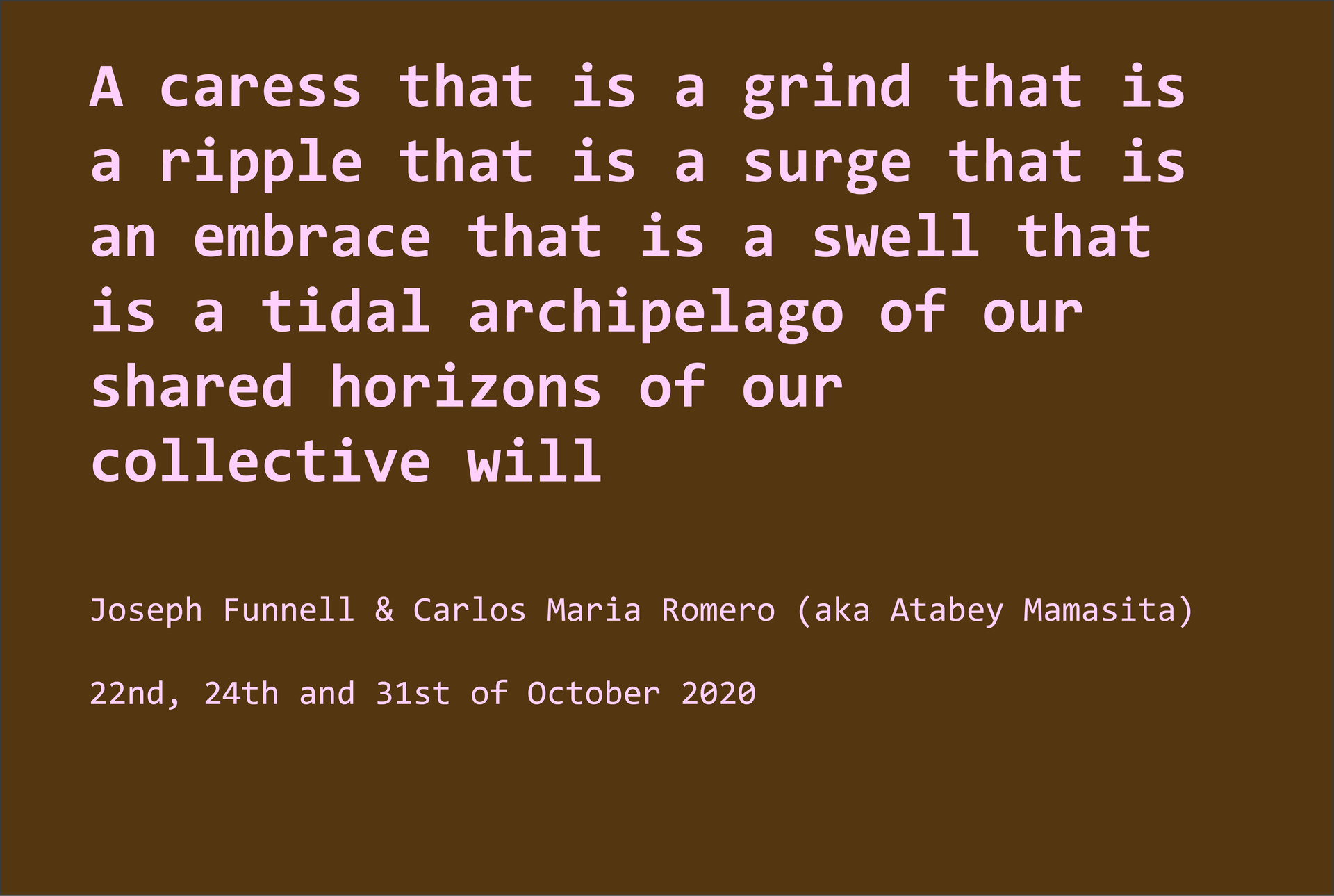 Developed by Carlos Maria Romero & Joseph Funnell during the months of August and October, 2020. Commissioned and produced by Cell Project Space as part of Cellular, made possible with the generous support of an Emergency Grant by Arts Council England. With thanks to Metro Charity for funding the initial research and development; Adelaide Bannerman and Phytology, Bethnal Green Nature Reserve; Sam Causer; Dan Ward, Tommie Introna and Blackshuck for the video and audio editing work; and Mirko Joao-Pedro, No Harmony, for the design work.