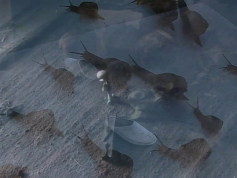 Central to the exhibition and a point of departure for the event is Echard’s film ‘The People’.  Shot over five years in the community and village where the artist grew up in the Cevennes mountains, France, it was rebuilt entirely in the 1970s as the result of a community wanting to extract itself from the complications of modern life. The slow pace of the villagers is portrayed as a colony of snails layered and disappearing beneath the pervading flood of consumables and technology.  Nearly thirty years later, the questions of what is left of the dream, the idyll isolation and the organisation of labour for the common good go beyond the image of Echard’s captured memories of utopian youth.