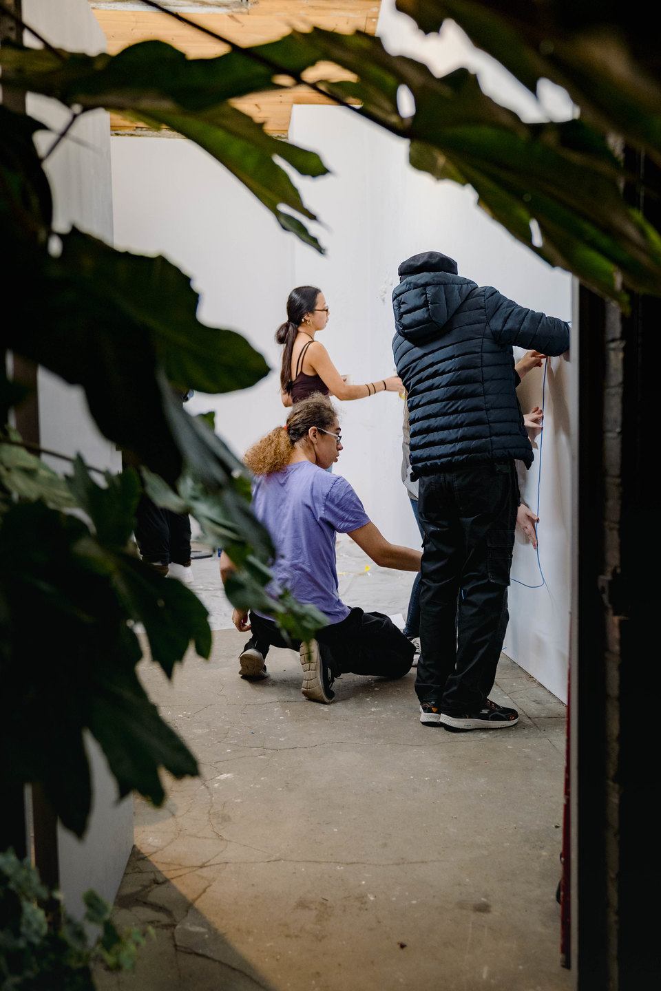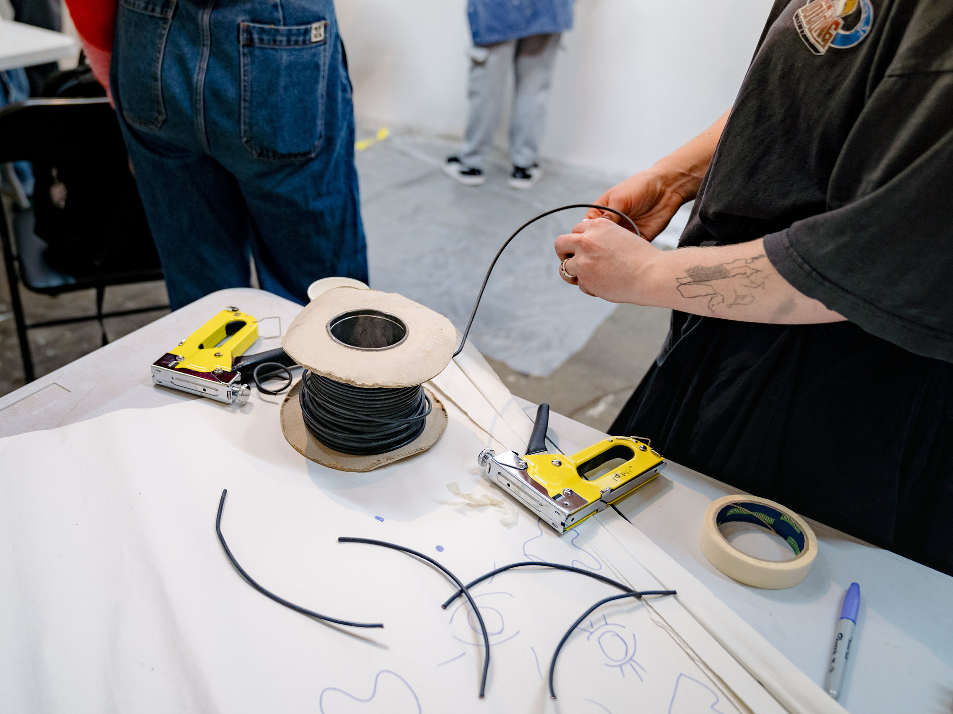 After reading and discussing Letter 50 as a framework for thinking through Pedan's exhibition, the group used electrical cable, staples and paint to produce a collaborative wall drawing that responded to the materials and ideas at play in Mouldings, Pedan's series of artistic interventions that ambivalently embellished the gallery walls.