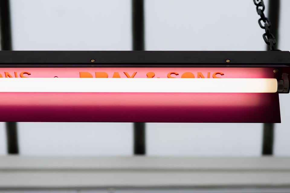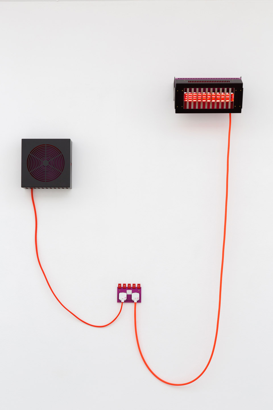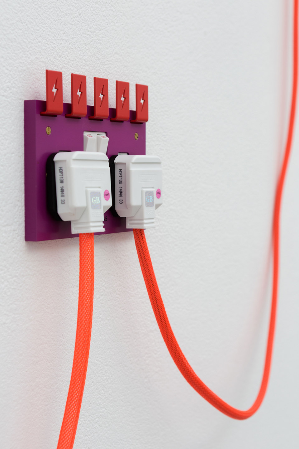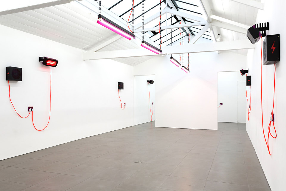 Presented in a formal style reminiscent of showroom presentation the exhibition quotes from the strategies of 1960’s minimalist art, although merely a point of departure for Dray. Factory-made to fit the logical electrical requirements for the gallery, artworks are treated as appliances. Dray resists specific aesthetic decision-making processes and relies on the functionally configured architectural standards for the building to reveal an existent template for the artist to work with. The structure and floor plan of the gallery become agency for the exhibition, with electrical functions of appliances synchronized and programmed, dictated by the capacity and availability of power in the room. Dray’s assessment of the works and consistent refusal to bypass function is based on a stringent protocol of security and safety standards outlined by the UK’s manufacturing regulatory body. Her methods aim to challenge the conventions of uniform engineering by hacking the hidden mechanics and functions of consumer products to reveal the reductionist strategies used by manufacturers today. By revisiting the masculine tropes in contemporary art, issues around a product’s political currency and social value, as well as the potential impact of how material and colour can effect response resonates within Dray’s application of metal finishes, detail and colour. The gallery becomes showroom in a ‘pumped up’ vision of industrial innovation and the artist’s signatory laser cut branding sits immovable inside hard-edged powder coated steel as the symbols of household and corporate efficiency are replaced by consumer desire.