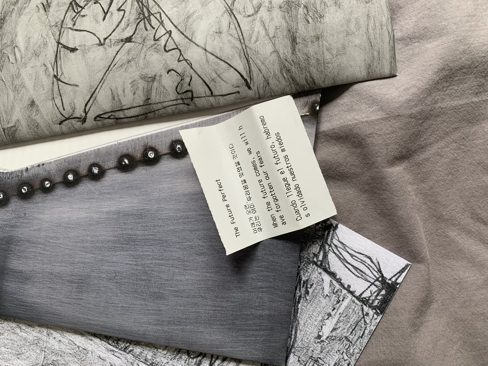Similarly highlighting the invisibility of what is all too often already painfully visible, Cortez and Lee’s Queer Correspondence comes to you as a recipient as well as with an open opportunity to facilitate your participation. Two postcards featuring messages to be added to and/or be completed are included for you to keep or decide to share with others. Also included as gifts within each package are individual desires in Korean, Spanish and English gathered by Cortez and Lee from artists, curators and thinkers that are part of their communities of support, and printed from an interactive sculpture by the artists. Titled The Future Perfect, and written in that grammatical tense, Cortez and Lee invite us to believe that “words have the power to will the future into being.”