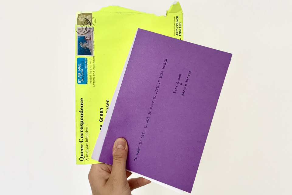TO WANT TO LIVE IS NOT TO WANT TO LIVE IN THIS WORLD is the title of Ezra Green and Martin Hansen’s Queer Correspondence commission, the third in our series of mail-art projects. As much a statement as an invocation, the sentence is also a line in Green’s poem, WALLS, included as part of the commission, where he describes a carceral-like deafening room containing nothing but “impossibility”. Until he hears another sound: