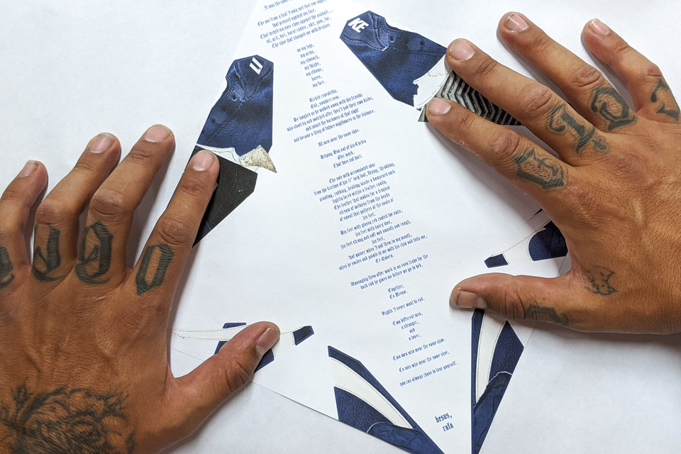 same shoe (Huitzilin – the healer) (2020), a 40cm x 40cm square print, features at its edges a digitally-collaged outline of a blue Nike Cortez shoe, containing at its centre a text that diagonally crosses the surface of the paper. The text is both a letter and a poem to a stranger who gay-bashed esparza on the streets of his native LA, an experience that the artist recounts alongside writing about an intimate moment with a lover, both of whom wear the same Nike Cortez shoe. By following the outlines of the shoe and the careful instructions provided by the artist in a video that can be accessed on Cell’s website (the details for which you can find on the accompanying postcard), the recipients of this project can choose to transform this print into an origami sculpture of a hummingbird; a sacred animal of healing which, once constructed, houses and guards close to its paper heart the words of esparza’s personal history.