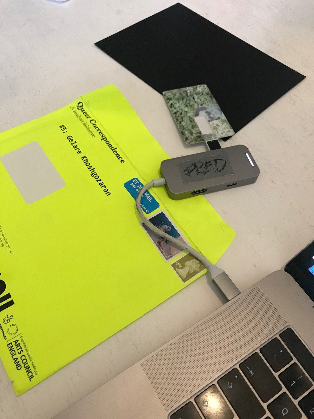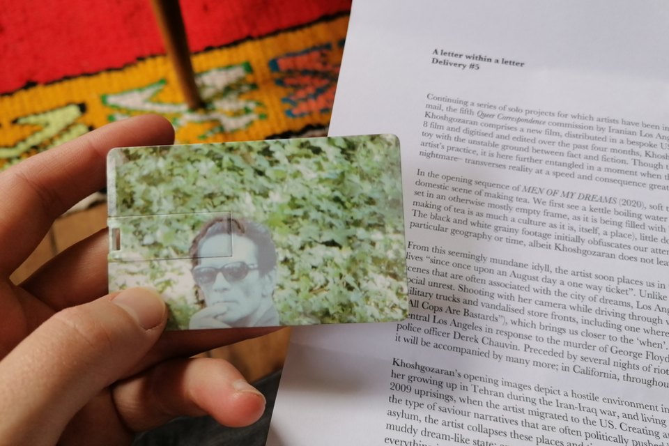 Continuing a series of solo projects for which artists have been invited to produce artworks to be distributed by mail, the fifth Queer Correspondence commission by Iranian Los Angeles-based artist, writer and filmmaker Gelare Khoshgozaran comprises a new film, distributed in a bespoke USB drive with a printed postcard. Shot on Super 8 film and digitised and edited over the past four months, Khoshgozaran’s film unfolds a series of vignettes that toy with the unstable ground between fact and fiction. Though this is a strategy reminiscent of much of the artist’s practice, it is here further entangled in a moment when the feeling of living within a dream –or a nightmare– transverses reality at a speed and consequence greater than most of our untethered imaginations.